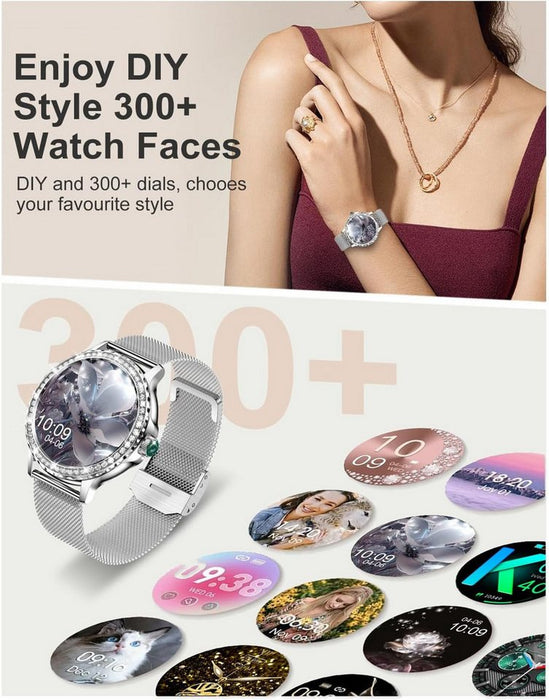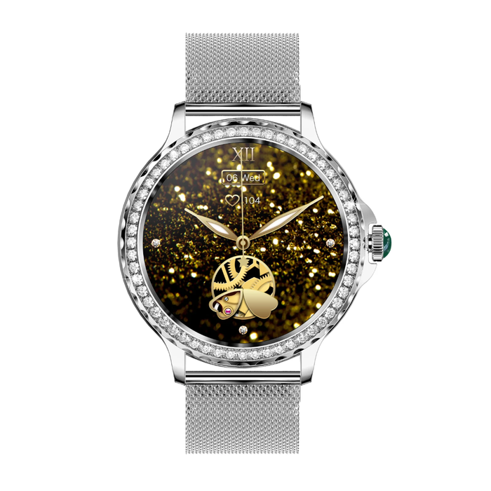 Diese Smartwatch für Damen überzeugt mit einem hochauflösenden 1,3-Zoll-HD-Farbdisplay (360 x 360 Pixel), das in jeder Umgebung hervorragend ablesbar ist. Der mit 60 glitzernden Zirkonia-Steinen besetzte Rahmen unterstreicht stilvoll Ihre feminine Ausstrahlung. Über 200 Zifferblätter stehen zur Auswahl – oder Sie gestalten Ihr eigenes Design mit persönlichen Fotos für einen ganz individuellen Look.