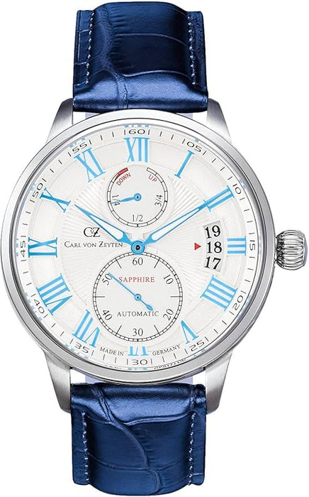 Das Gehäuse aus silbernem Edelstahl misst 45 mm im Durchmesser und bietet eine robuste und stilvolle Basis für das hochwertige Zifferblatt. Das weiße Zifferblatt bietet eine hervorragende Lesbarkeit und ist mit Stunden-, Minuten- und kleinen Sekundenanzeigen sowie einem Datumsfenster und einer Gangreserveanzeige versehen. Das Carl von Zeyten Logo zeugt von Qualität und Exklusivität.