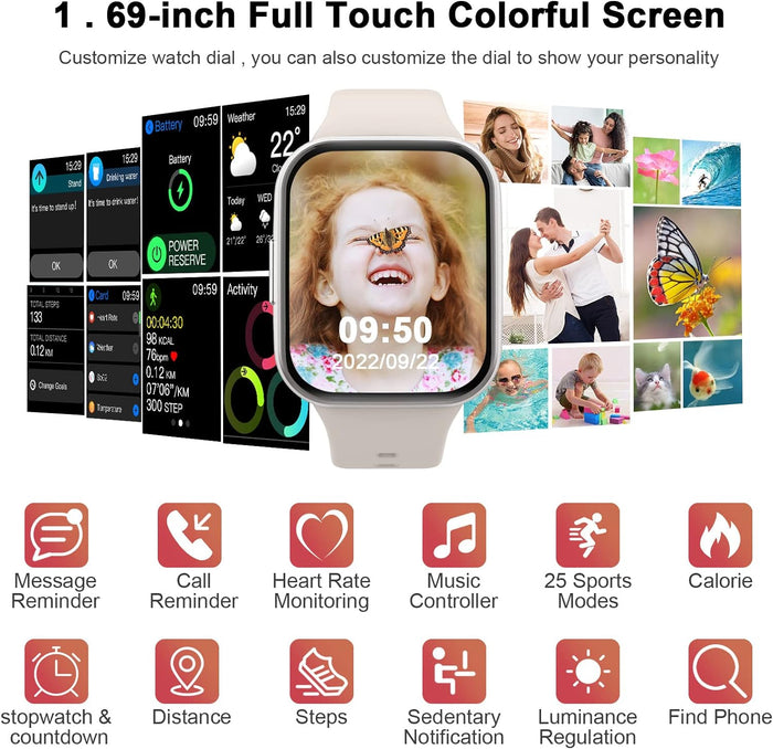 • 1,69 Zoll TFT Farbdisplay und Individualisierbares Zifferblatt: Das 1,69 Zoll Full-Touch Display mit HD Farbqualität und einem eleganten Metallgehäuse bietet ein herausragendes visuelles Erlebnis. Wählen Sie aus 4 Helligkeitsstufen und über 100 verschiedenen Zifferblättern. Personalisieren Sie Ihr Display mit einem eigenen Foto als Hintergrundbild, um Ihren individuellen Stil widerzuspiegeln.