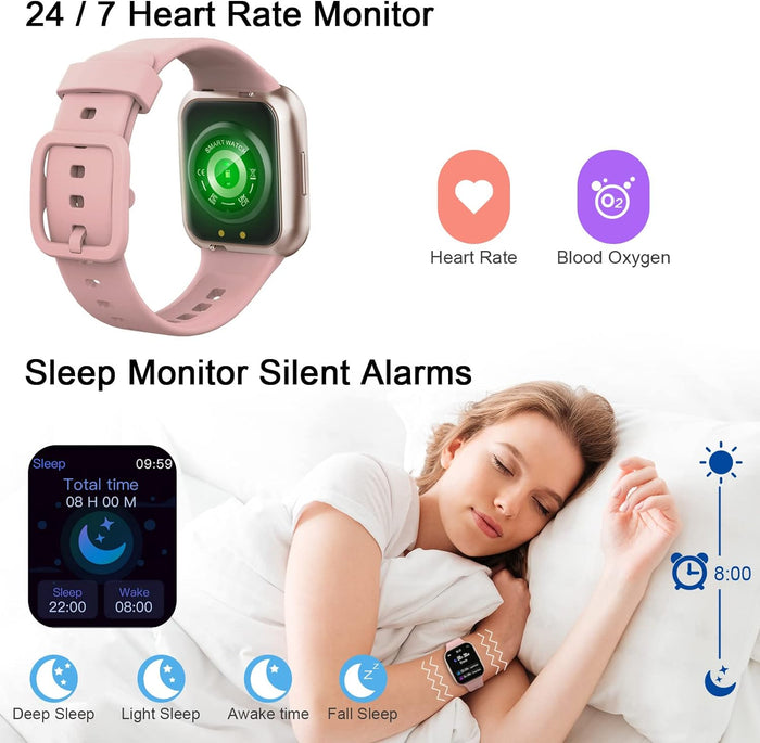 • 24/7 Herzfrequenzmessung, Blutsauerstoff & Schlaftracker: Die NovaTech FitPulse unterstützt die kontinuierliche Überwachung von SpO2 und Herzfrequenz, um Ihr Wohlbefinden besser zu verstehen. Die Uhr analysiert auch Ihren Schlaf, einschließlich Wachzeiten, leichtem und tiefem Schlaf. Sie erinnert Sie außerdem an das Trinken von Wasser und motiviert zu Bewegungspausen bei längerem Sitzen.