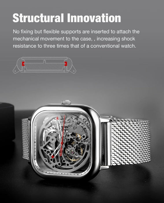 Innovative Konstruktion: Das mechanische Uhrwerk ist nicht durch eine Befestigung, sondern durch flexible Stützen mit dem Gehäuse verbunden, was die Stoßfestigkeit im Vergleich zu einer herkömmlichen Uhr um das Dreifache erhöht. 3 ATM Wasserdicht, ideal für den täglichen Gebrauch.