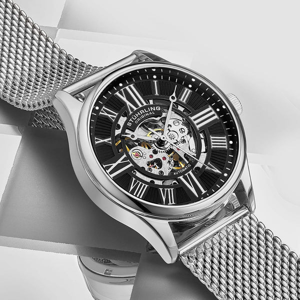Stuhrling Herren Automatikuhr mit Mesh-Armband – Skelettierter Klassiker