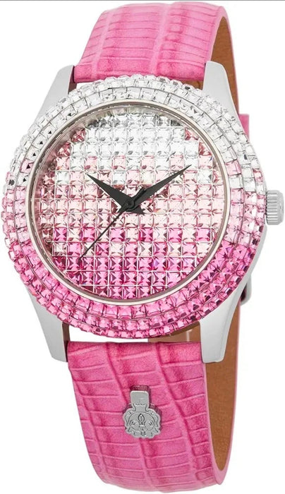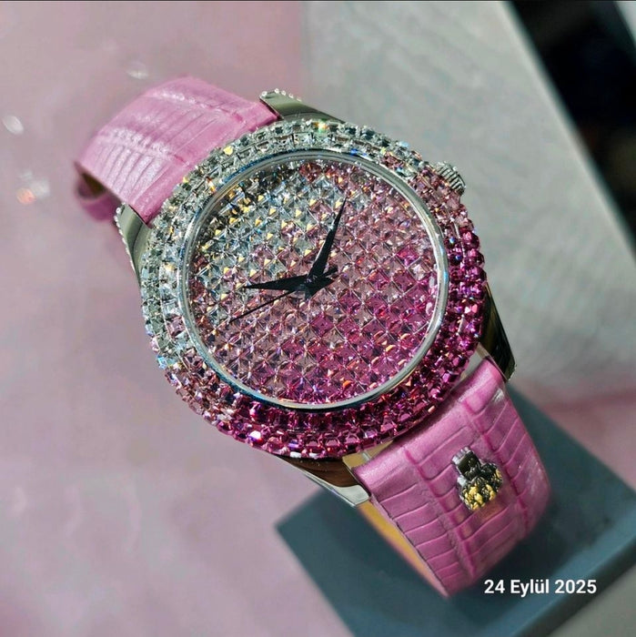 Besatz: Funkelnde Swarovski-Steine auf dem Zifferblatt und der Lünette im eleganten Farbverlauf (Rosa/Weiß).