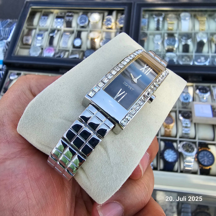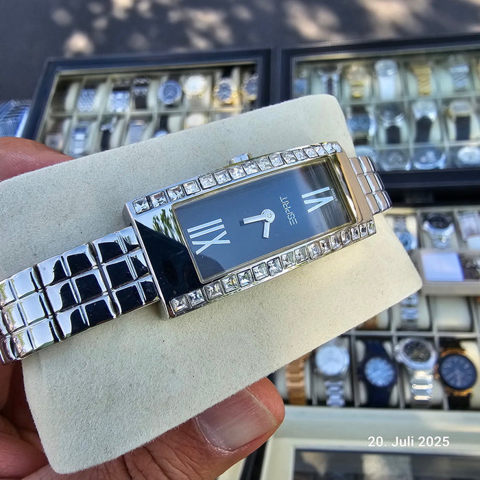 Erleben Sie zeitlose Eleganz mit der Esprit Damenarmbanduhr 'Kate', veredelt mit einem exquisiten Swarovski Kristall, der jedem Outfit einen Hauch von Luxus verleiht. Diese klassische Uhr vereint Funktionalität und Stil, indem sie ein präzises Quarzwerk, ein 12-Stunden-Zifferblatt und eine Wasserdichtigkeit bis zu 10 Meter bietet. Das rechteckige Design in edlem Silber, kombiniert mit einem schwarzen Zifferblatt und einem hochwertigen Gehäuse, macht diese Uhr zu einem unverzichtbaren Accessoire für jede modebewusste Frau.