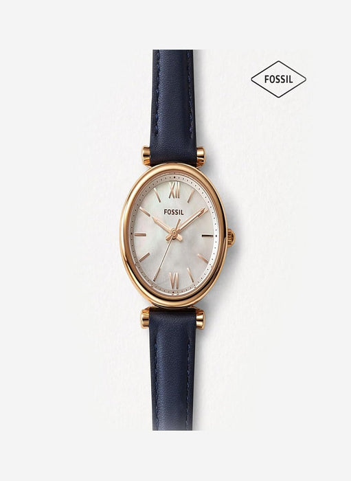 Die Fossil Carlie ist eine elegante Damenarmbanduhr, die Stil und Funktionalität vereint. Mit ihrem blauen Lederarmband und dem edlen Edelstahlgehäuse ist sie ein echter Blickfang. Die Uhr ist mehr als nur ein Accessoire – sie ist ein Ausdruck Ihrer Persönlichkeit.