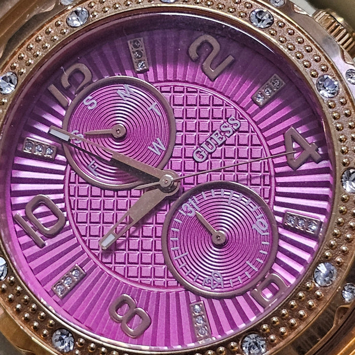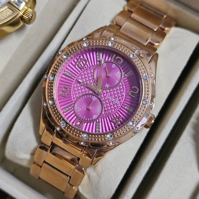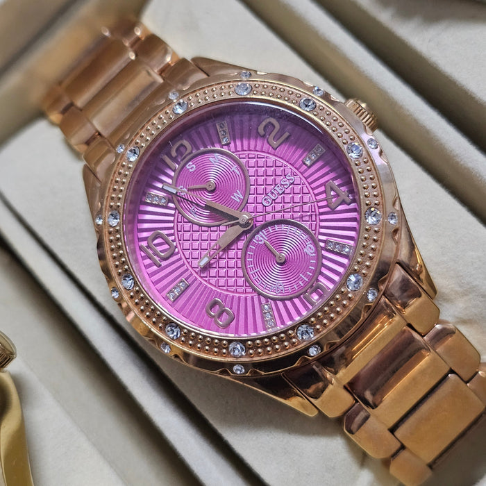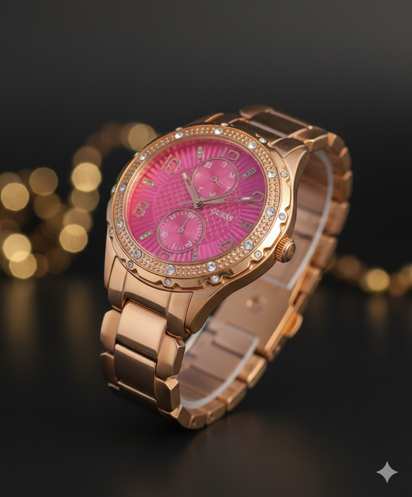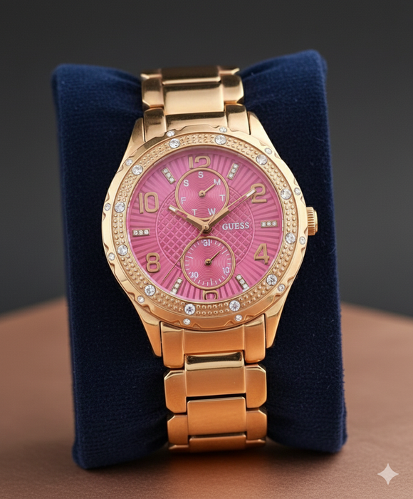 • Zifferblatt: Auffälliges Pink mit feiner Textur und dem charakteristischen GUESS-Logo