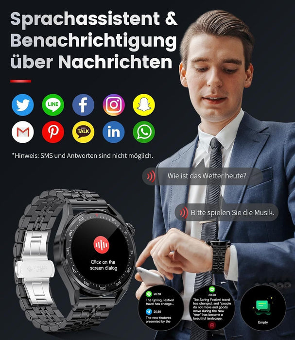Bluetooth-Verbindung für freihändige Kommunikation: Integrierte Lautsprecher und Mikrofone ermöglichen Ihnen, Anrufe entgegenzunehmen, Musik zu genießen und Benachrichtigungen von Facebook, Twitter, WhatsApp, Instagram und Skype direkt auf Ihrem Handgelenk zu empfangen. Die Vibrationsfunktion stellt sicher, dass Sie keine wichtigen Informationen verpassen.