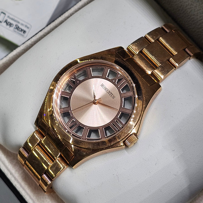 Die Momentus DW293R ist mehr als nur eine Uhr – sie ist ein Statement. Das transparente Zifferblatt erlaubt einen faszinierenden Blick auf das präzise Quarzwerk, während das Roségold-Finish für einen Hauch von Luxus sorgt. Das Armband, ebenfalls in Roségold gehalten, schmiegt sich angenehm am Handgelenk und sorgt für einen hohen Tragekomfort. Die robuste Konstruktion und die Wasserdichtigkeit machen diese Uhr zu einem zuverlässigen Begleiter im Alltag.